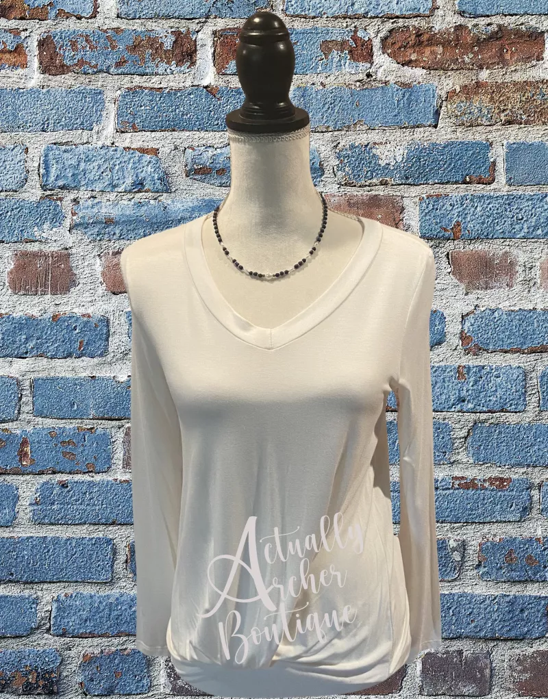 Long Sleeved V-Neck Knotted Top Ivory