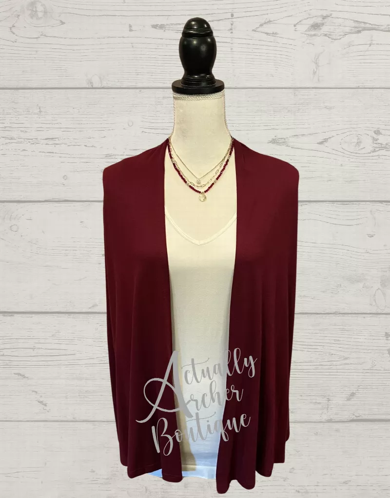 Elevate your wardrobe with this effortlessly chic light burgundy open-front cardigan, a perfect blend of comfort and style. Designed with a relaxed, draped silhouette, this cardigan is crafted from lightweight fabric for all-day comfort. Has an open front with no buttons or zippers, offering a minimalist and modern look. The sleeves are full-length for added warmth and coverage. Made in the USA.