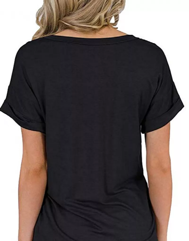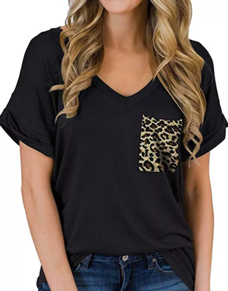 Black V-Neck T-Shirt with a leopard pocket. This T-shirt can be worn casually for work or business. This T-shirt is a must-have for your wardrobe.